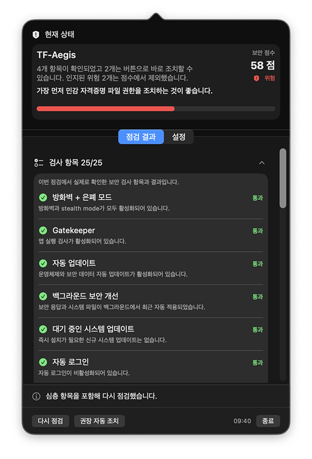 TF-Aegis는 메뉴바에서 바로 실행하는 로컬 PC 보안 점검 에이전트입니다. AI로 일하는 1인 창업가와 1인 기업가에게 반복해서 생기는 문제, 예를 들면 뒤엉킨 시스템 설정, 외부로 열려 있는 로컬 AI 포트, 느슨해진 Claude/Codex 정책, 평문 API 키, 수상한 자동 실행 항목을 한 번에 보여줍니다.